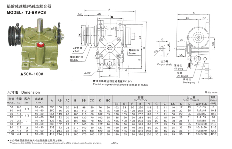 電磁離合剎車減速機適合匹配規(guī)格2.5KG、5KG、10KG的電磁離合器與制動器,而減速機傳動比則有10、20、30、40、50、60共6個,減速機中心距有50、60、70、80、100共5個(型號)。安裝尺寸規(guī)格如下: