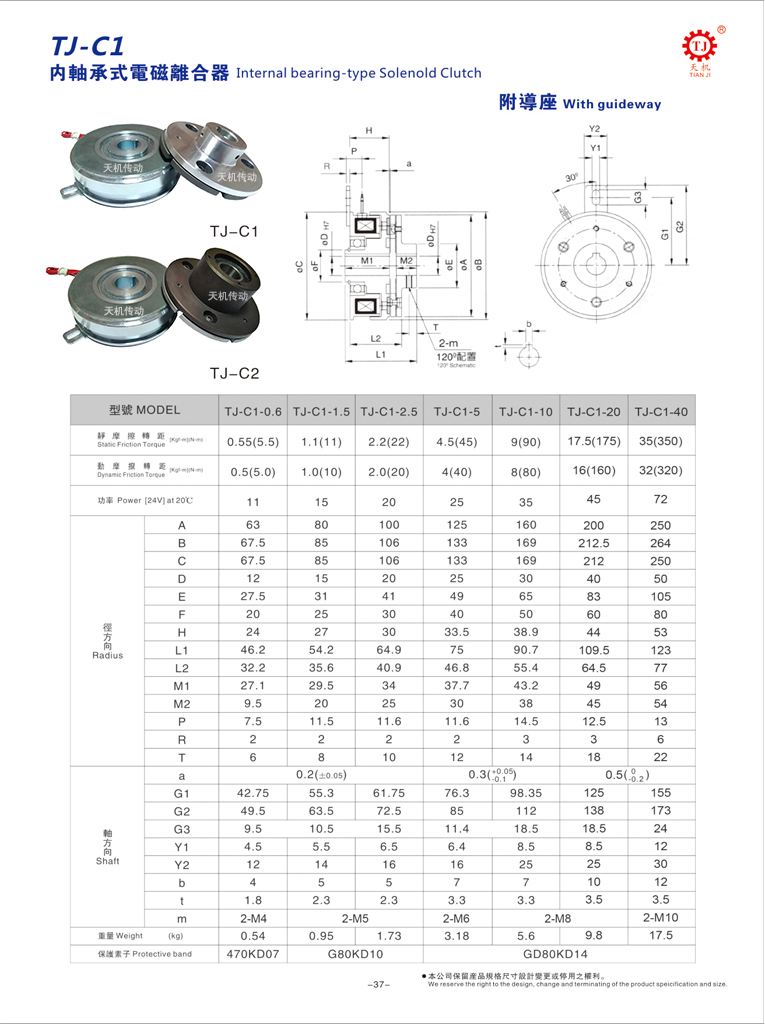 天機(jī)傳動(dòng)軸承安裝型電磁離合器由銜鐵(電樞板)、定子、轉(zhuǎn)子、板型彈簧片、磁性線圈、來令片、軸承、鋁導(dǎo)座等元件構(gòu)成,統(tǒng)一使用DC24V,標(biāo)準(zhǔn)規(guī)格0.6-40KG。