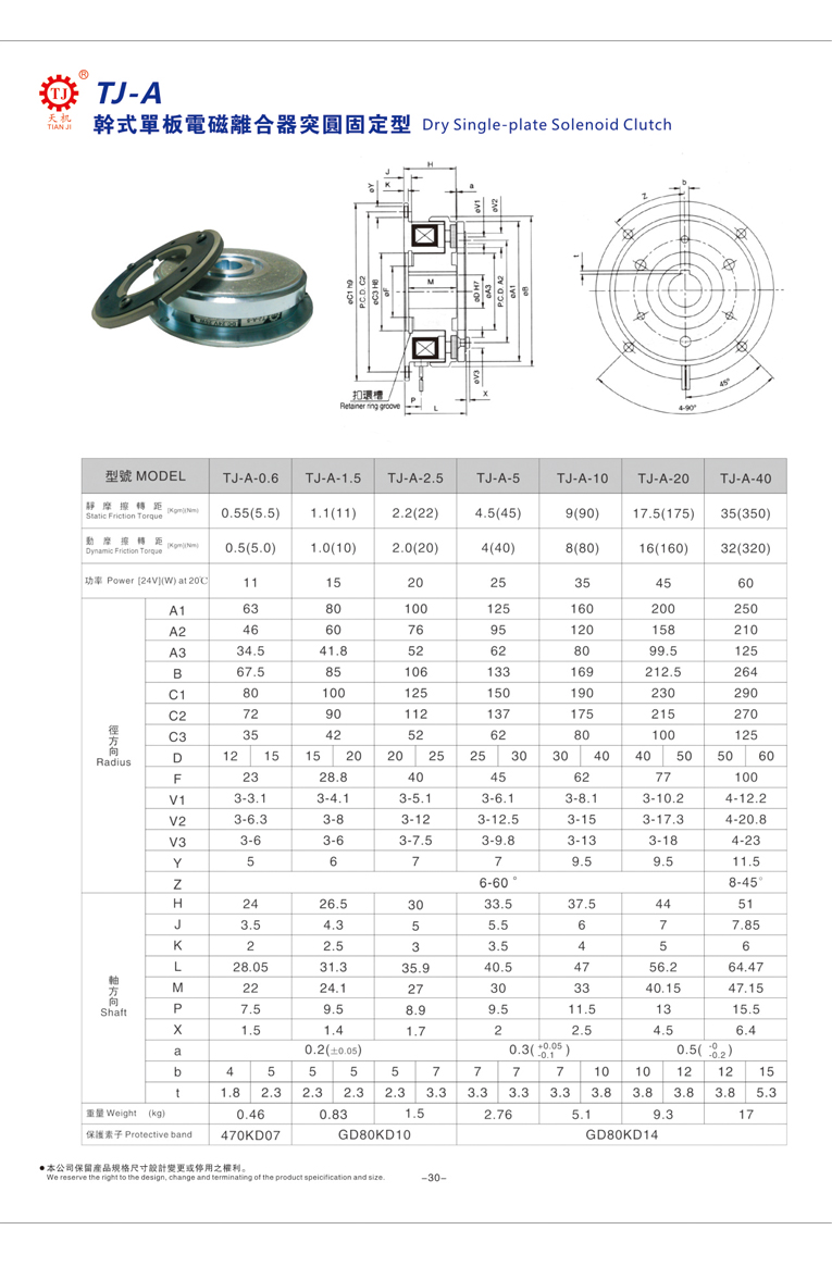 天機(jī)傳動(dòng)摩擦式電磁離合器由銜鐵(電樞板)、定子、轉(zhuǎn)子、板型彈簧片、磁性線圈、來令片、軸承等元件構(gòu)成,統(tǒng)一使用DC24V,標(biāo)準(zhǔn)規(guī)格0.6-40KG。